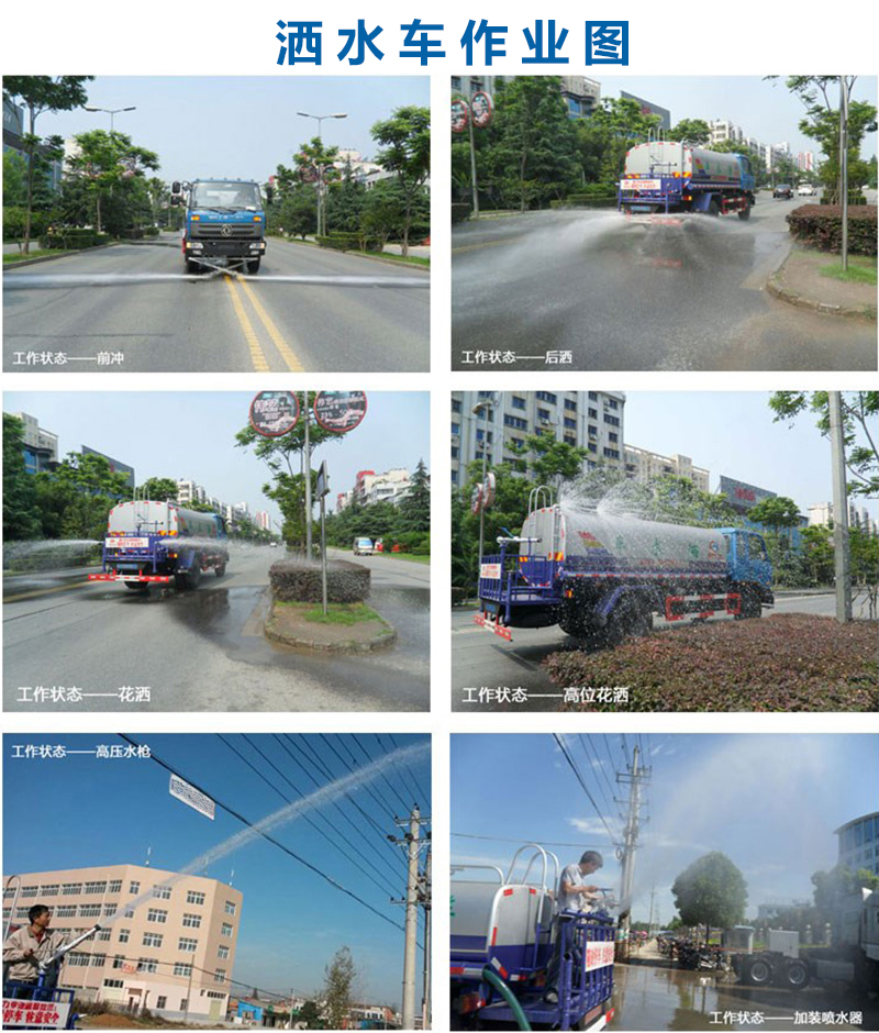 3.载货洒水车:水罐装在载货车箱内,配洒水泵,也可装水龙头用于工地和矿区储水。